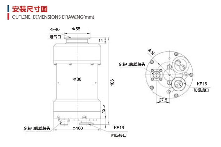 | 进气口法兰 | DN 40 kF | 建议前级泵(L/S) | 0.5-1 |
